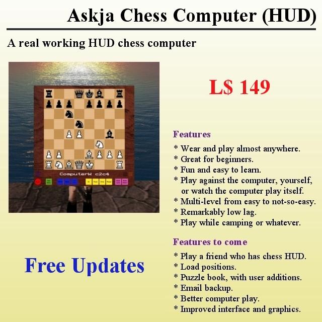 | Features include: - Play against the computer or yourself. - Watch the computer play itself. - Play while camping or whatever. - Multi-level ranging from very easy to advanced. - List game stats and history in chat. - Owner has full control using buttons and menus. - Fully self-contained chess engine without using web server. - Uses 82 prims. - Low lag - 0.5mS. - Free updates. Visit our Casino and games room on Passionfruit Island and try out our games for free:- Passionfruit Island(217,87,31)teleport |