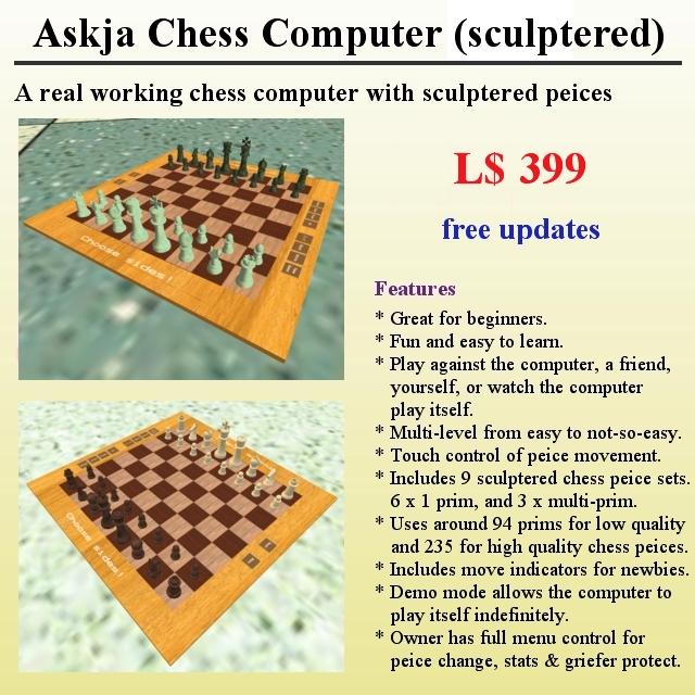 | Features include: - Play against the computer, yourself, a friend. - Watch the computer play itself. - Multi-level ranging from very easy to advanced. - Touch control of piece movement. - Includes 9 sculptured chess piece sets. - 22 prims with no pieces - 54 prims with single prim pieces - 94 prims average when playing - Includes move indicators for newbies. - In Demo mode the computer plays its self indefinitely. - List game stats and history in chat. - Owner has full control using buttons and menus. - Color changing for board and buttons - High quality textures for board and buttons - Anti-griefing prevents game interference. - Fully self-contained chess engine without using web server. - Uses 95 prims. - Low lag board = 0.2mS + 0.025mS per piece = 1.8mS total. - Free updates.a Visit our Casino and games room on Passionfruit Island and try out our games for free:- Passionfruit Island(217,87,31)teleport |