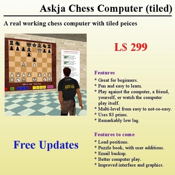 | Features include: - Play against the computer, yourself, a friend. - Watch the computer play itself. - Multi-level ranging from very easy to advanced. - Resizable from 1.7m to 10m. - List game stats and history in chat. - Owner has full control using buttons and menus. - Anti-griefing prevents game interference. - Fully self-contained chess engine without using web server. - Uses 82 prims. - Low lag - 0.5mS. - Free updates. Visit our Casino and games room on Passionfruit Island and try out our games for free:- Passionfruit Island(217,87,31)teleport |