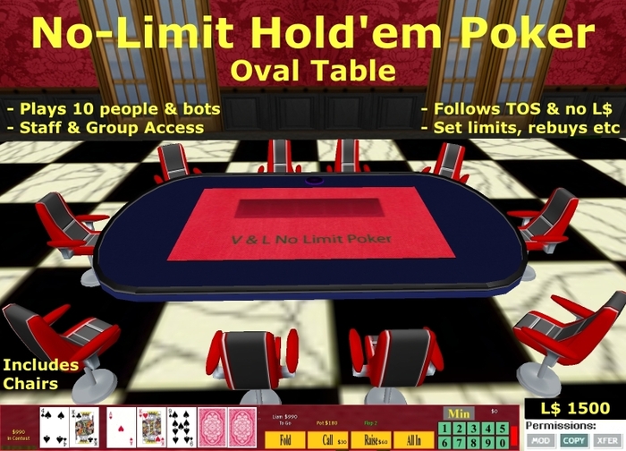 NoLimit Holdem Poker Tables Our No-Limit Holdem Poker tables come in both the traditional oval shape and the more compact round shape. Both tables are functionally the same except the round table uses only 30 prims and can fit into smaller rooms such as a home. The oval table uses 35 prims and is more suited to Casinos and Games Rooms where guests are more likely to prefer this traditional table style. To play poker each person must take a HUD from the table so they can see their private cards and interact with the game. Our No-Limit poker tables know the full rules of Limit Holdem poker and have adjustable starting chips, betting, buyins. They can also handle All-Ins from multiple players. These table feature up to 10 named computer opponents who each have their own playing style. There are 3 difficulty modes ranging from easy, medium to hard. The owner has a detailed set of menus with many options and can choose to allow group members or designated staff to control some table functions. There is also a Protection Mode to prevent griefers spoiling the fun. |